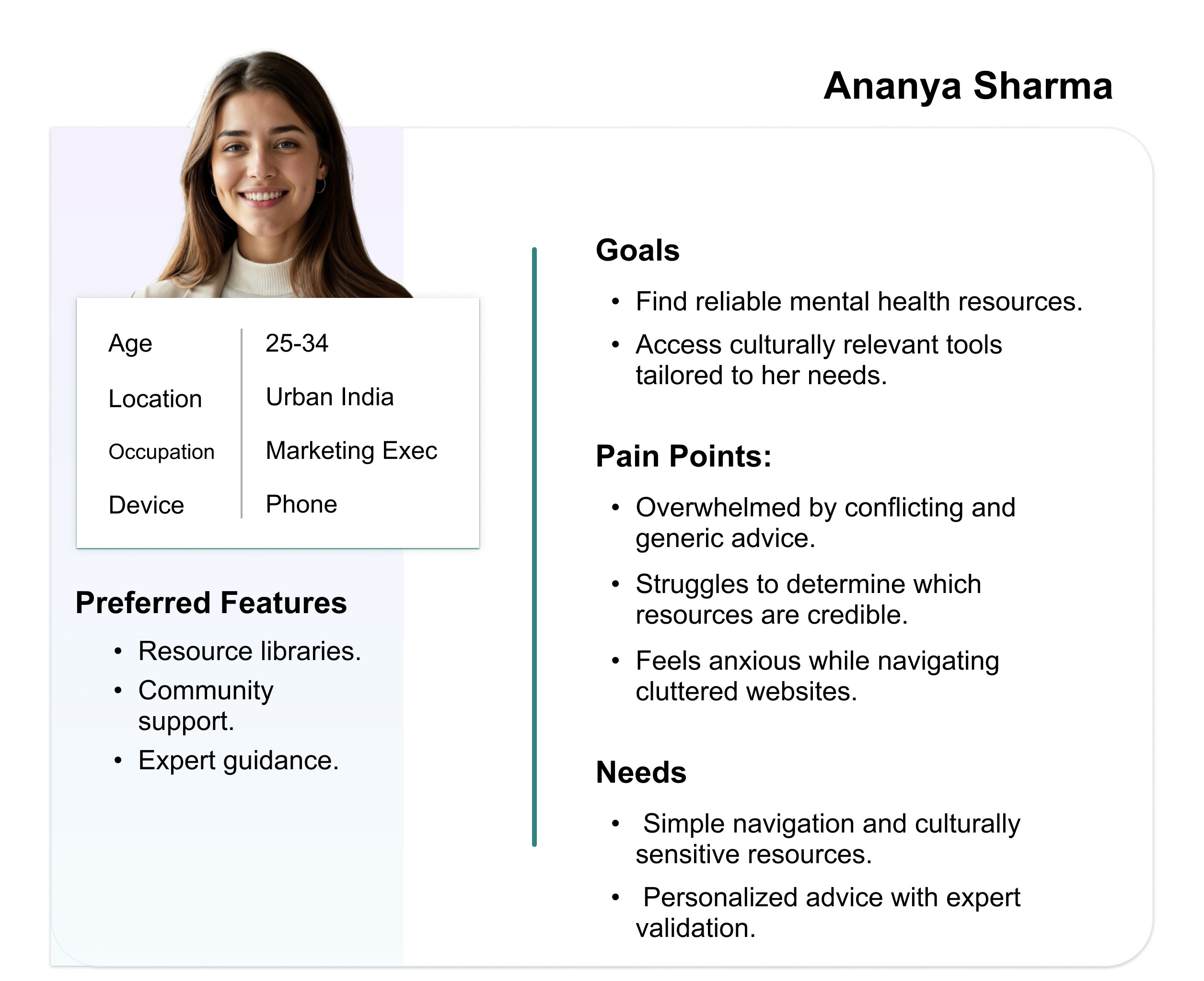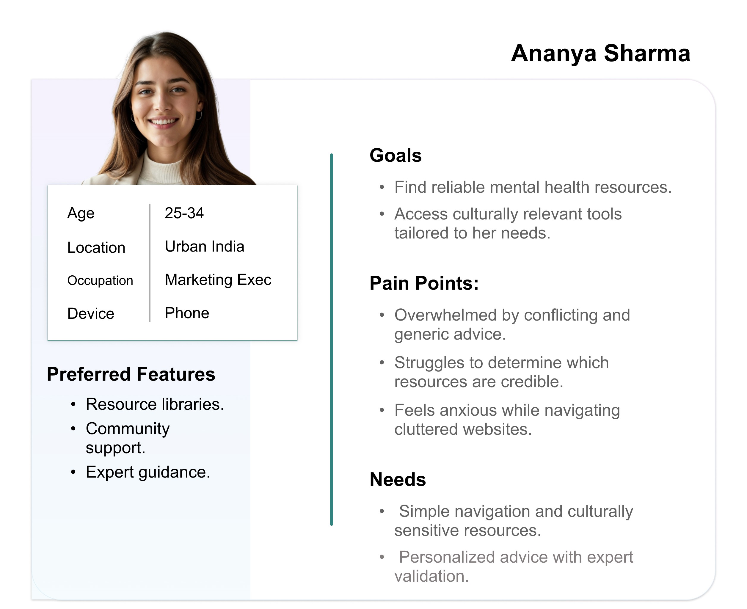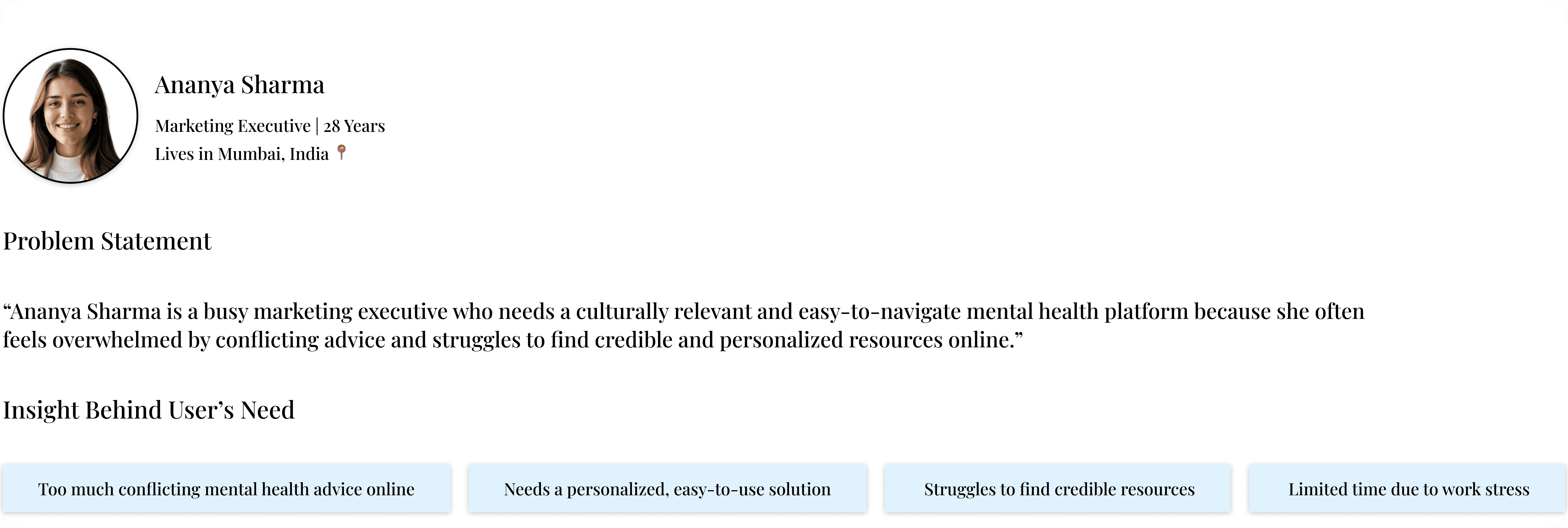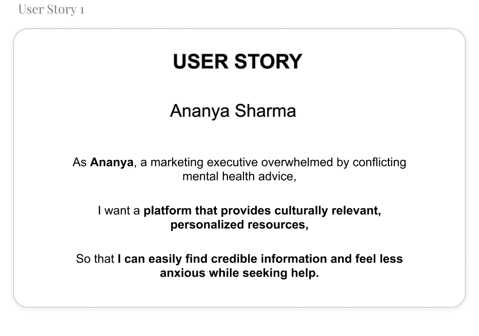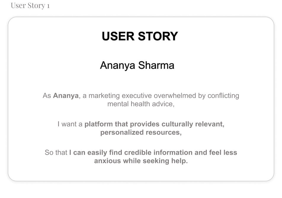 “Ananya Sharma is a busy marketing executive who needs a culturally relevant and easy-to-navigate mental health platform because she often feels overwhelmed by conflicting advice and struggles to find credible and personalized resources online.”