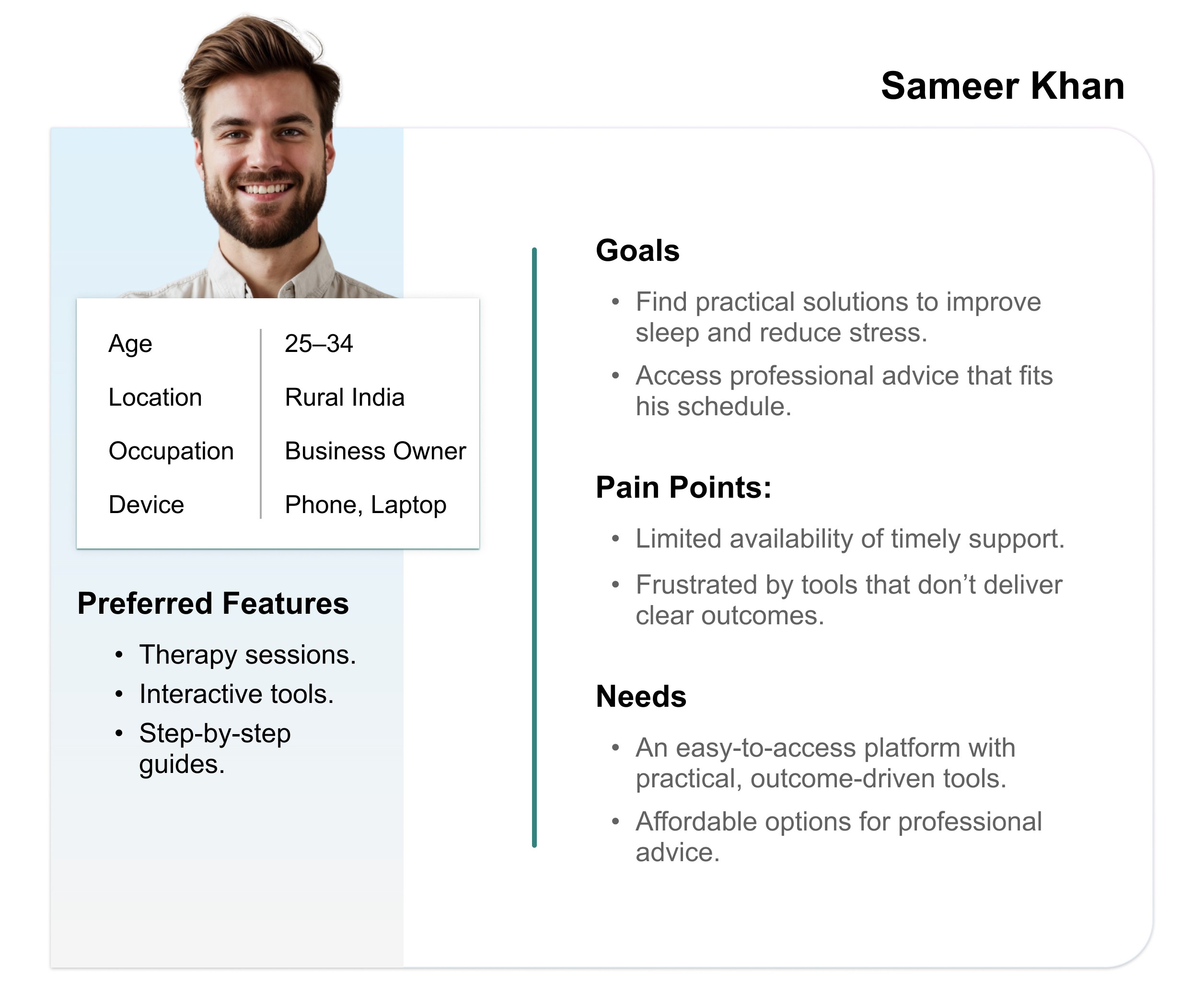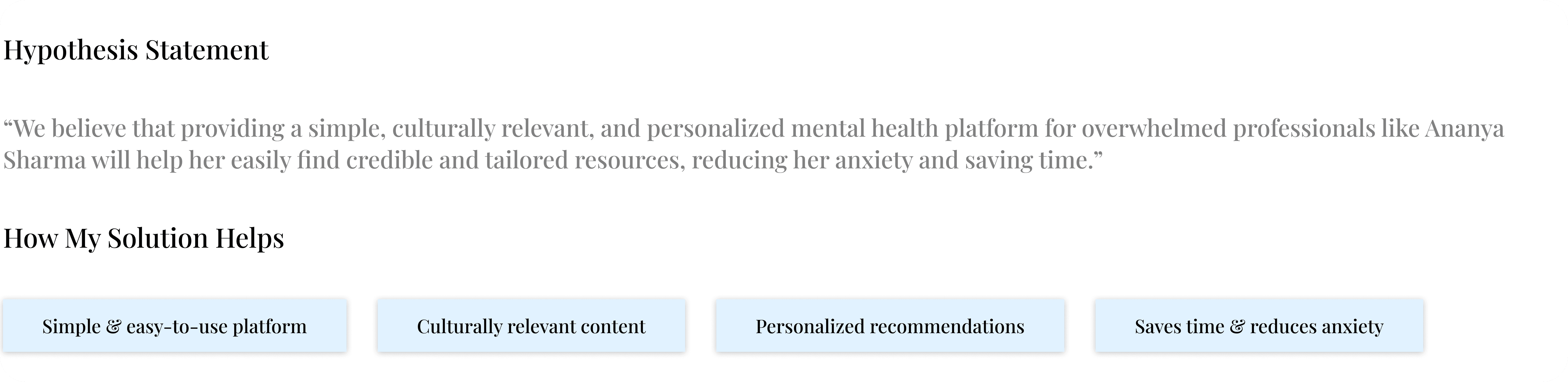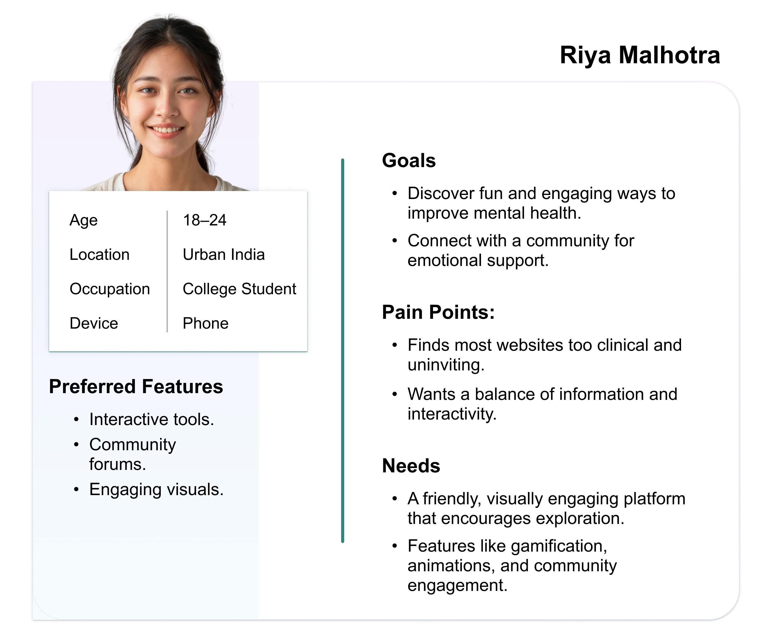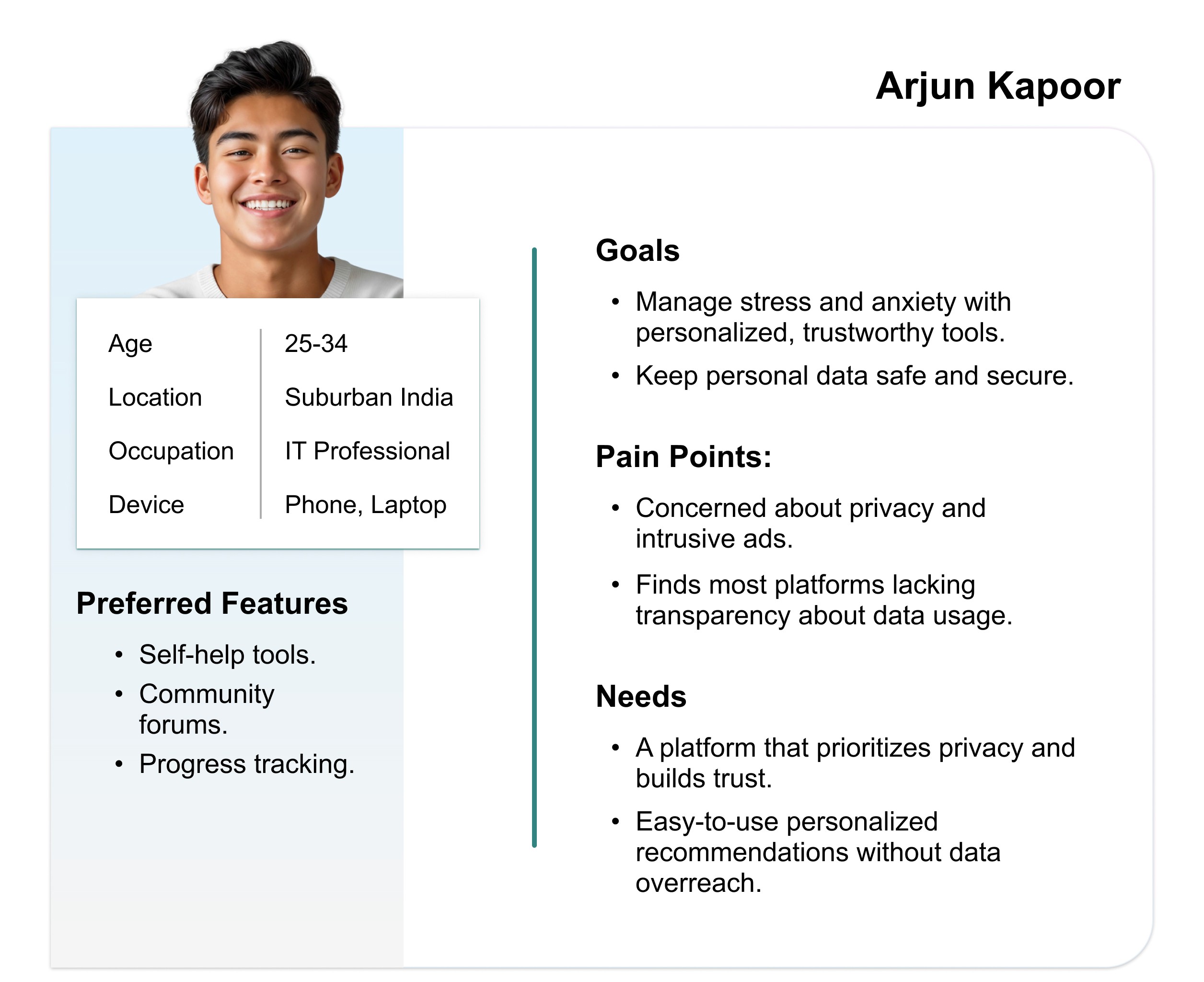 “Ananya Sharma is a busy marketing executive who needs a culturally relevant and easy-to-navigate mental health platform because she often feels overwhelmed by conflicting advice and struggles to find credible and personalized resources online.”