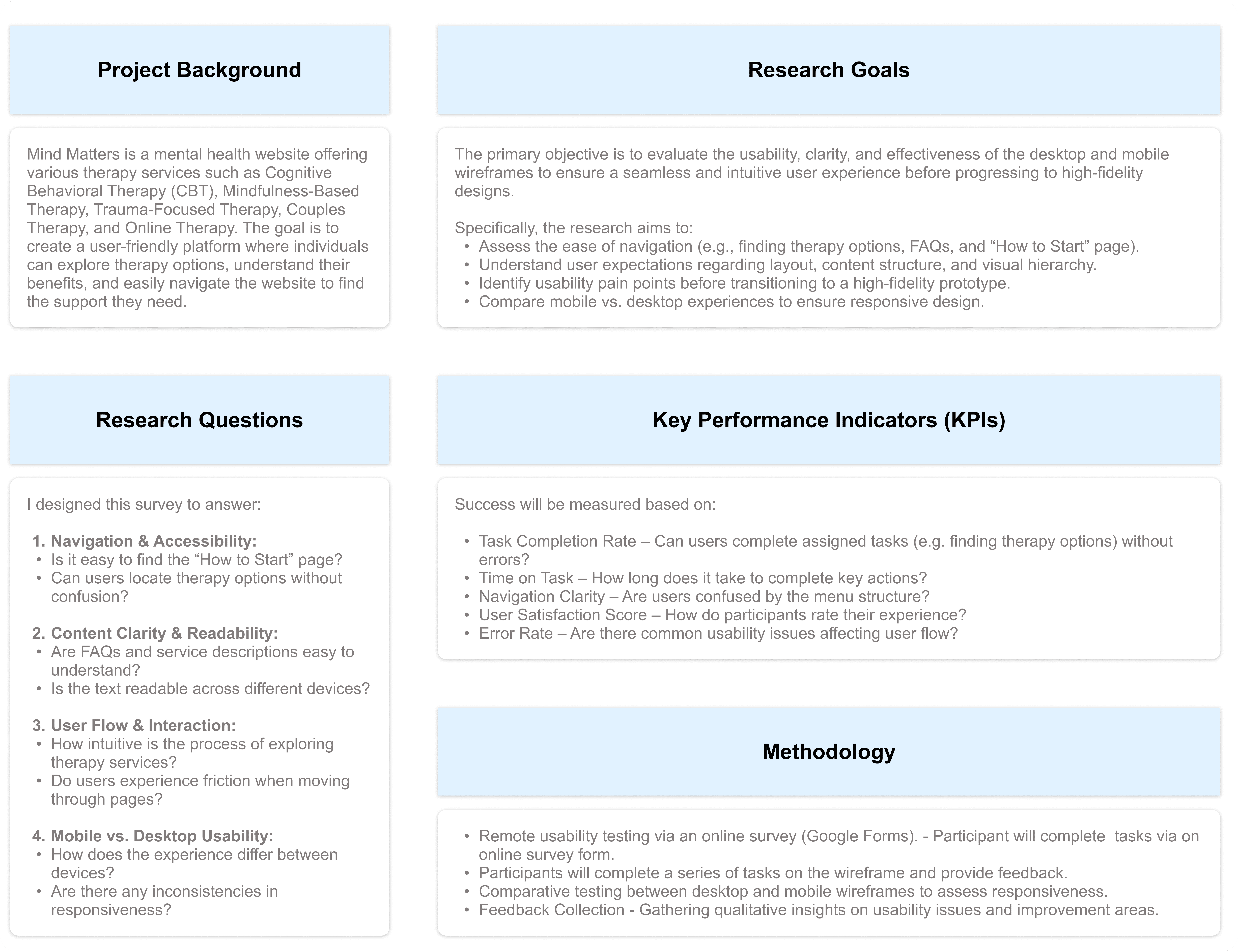After completing the low-fidelity prototype for Mind Matters, I needed to ensure the lo-fi prototype structure, navigation, and content flow aligned with user expectations before moving into high-fidelity design.