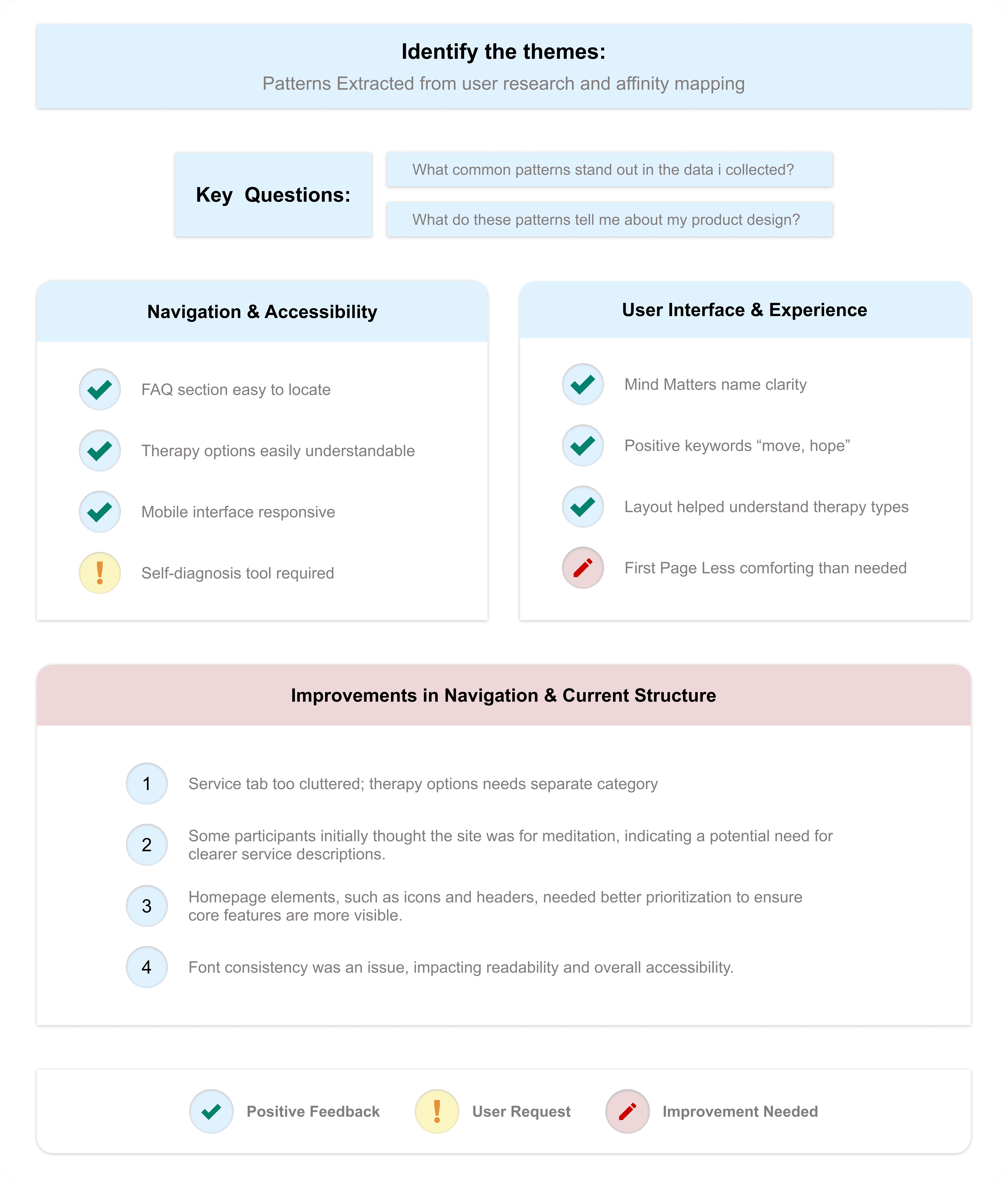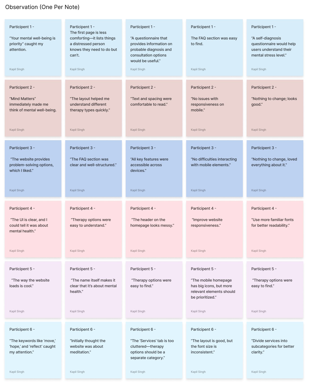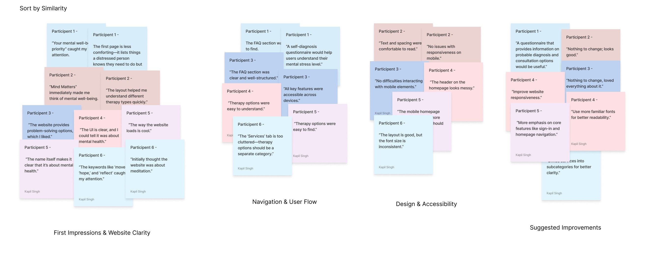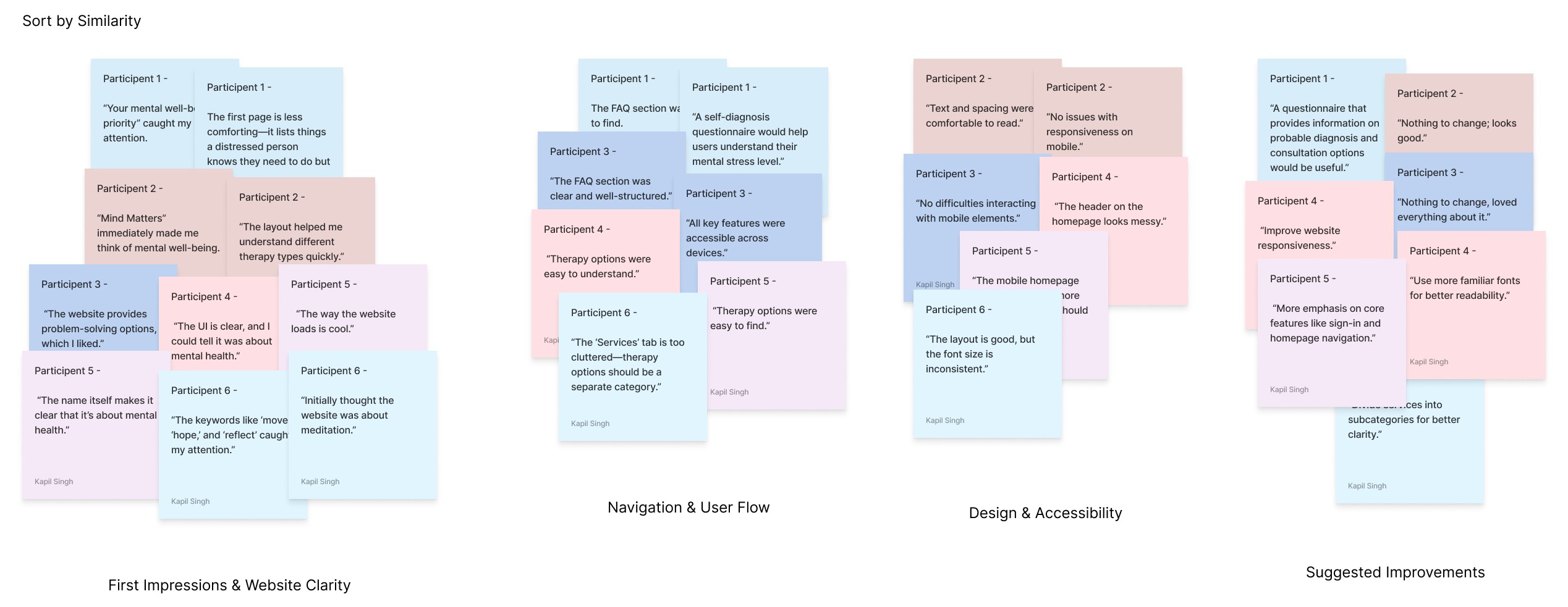 By following this process, I successfully synthesized and categorized usability feedback for Mind Matters, helping to prioritize areas for refinement in the website’s design. Would you like a visual representation of the affinity diagram?