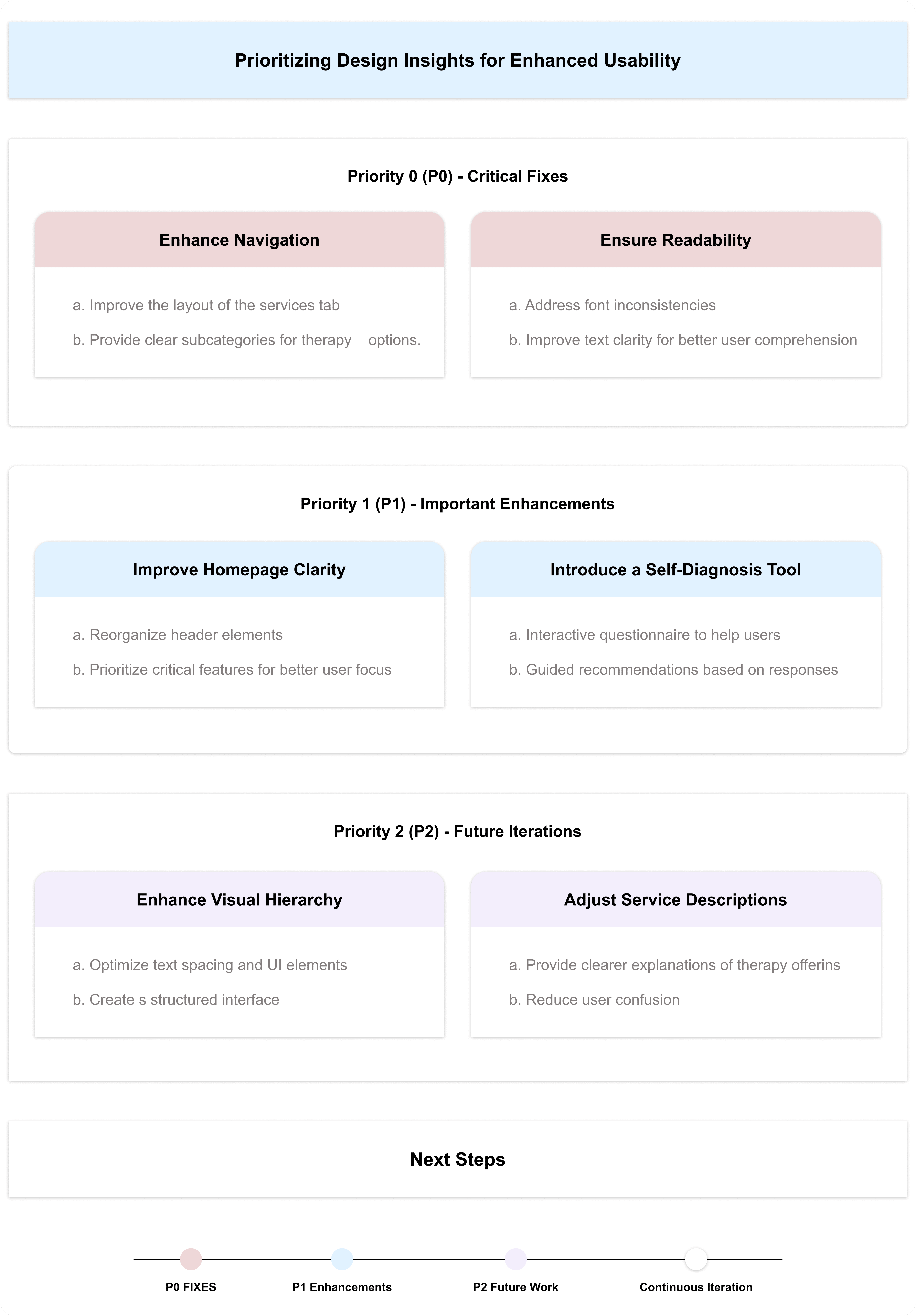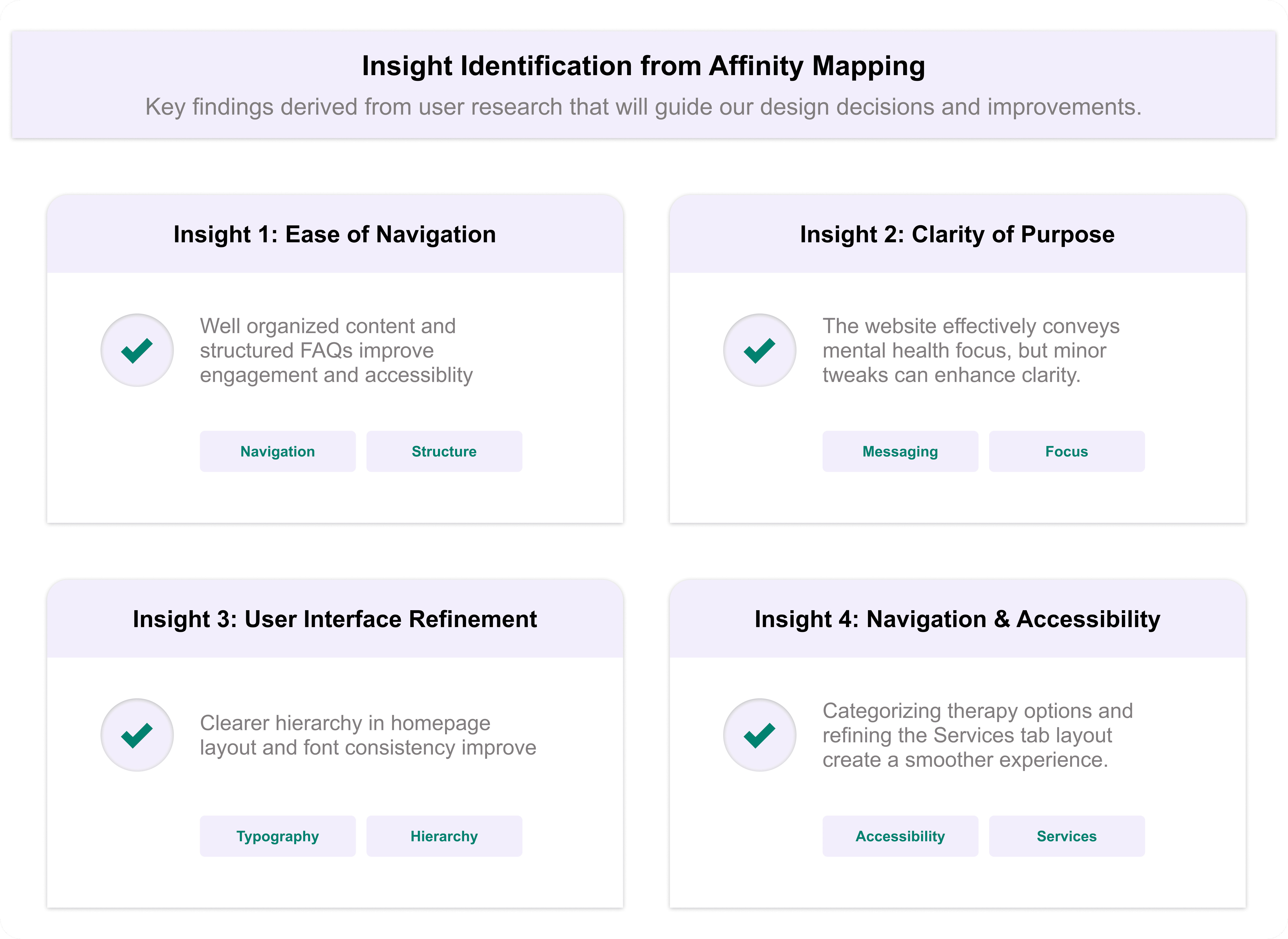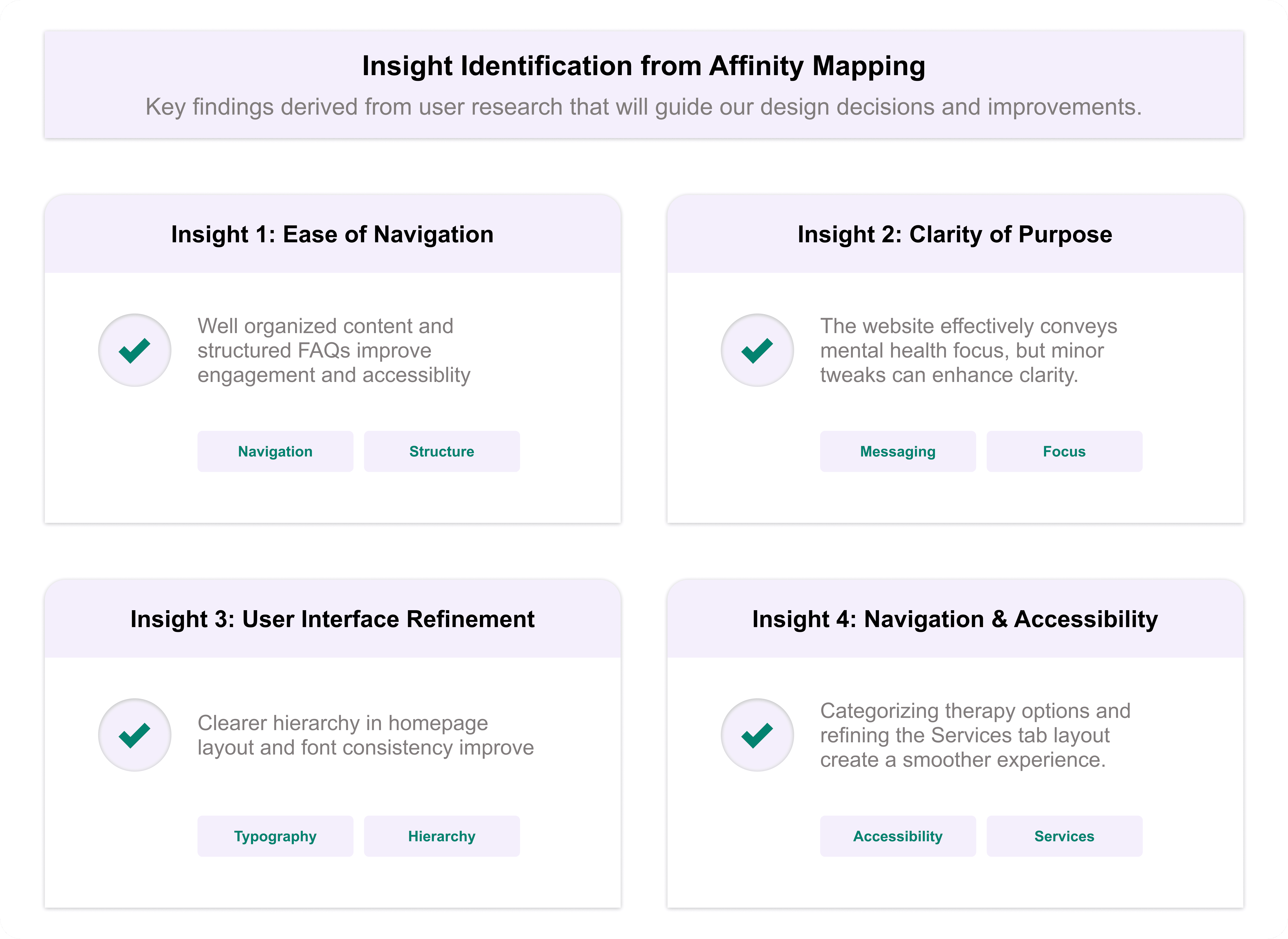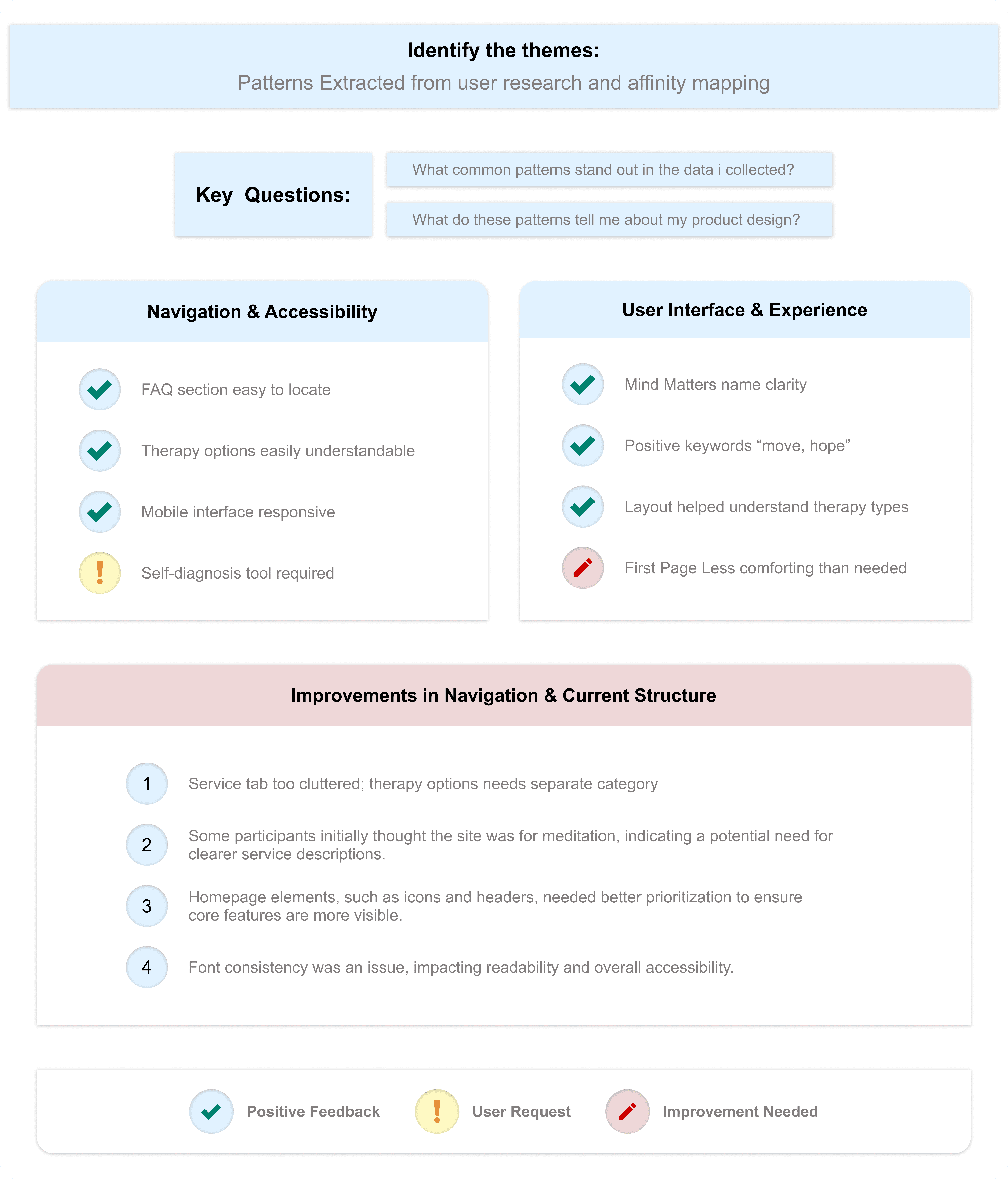 By following this process, I successfully synthesized and categorized usability feedback for Mind Matters, helping to prioritize areas for refinement in the website’s design. Would you like a visual representation of the affinity diagram?