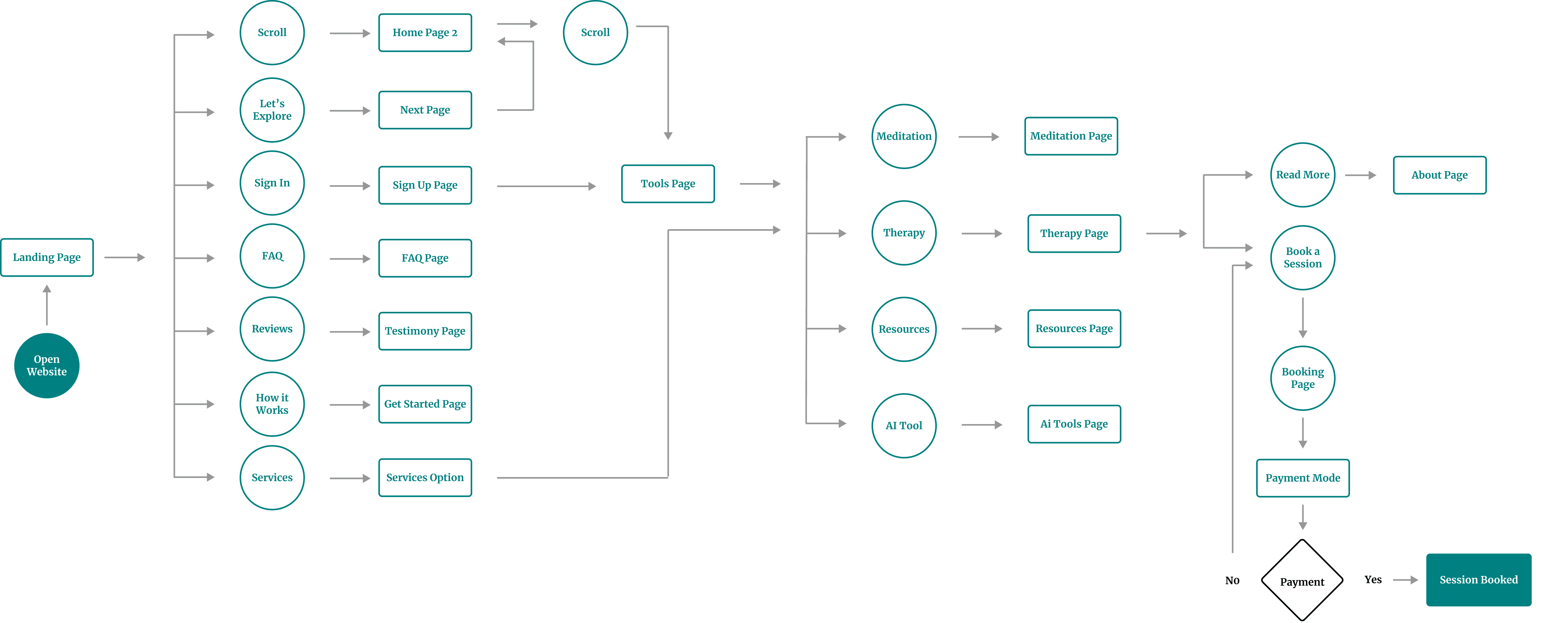 The user flow map I created for Mind Matters website outlined the step-by-step journey a user took, from opening the website to booking a session. I designed it to provide a seamless and intuitive experience, guiding users efficiently through the website’s features and functions.