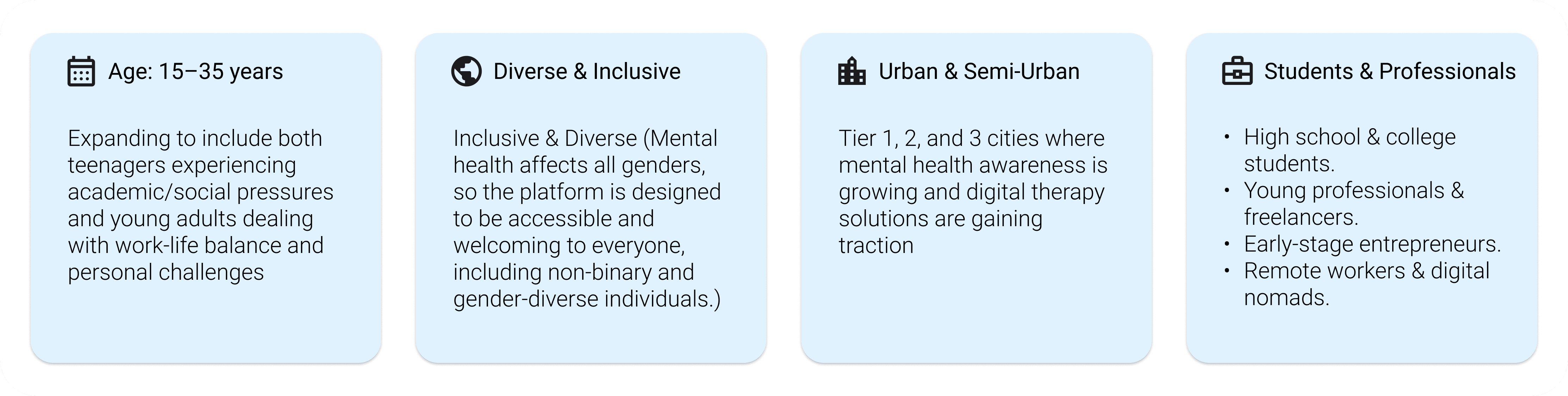 By focusing on this audience, MindMatters ensures that its features, user interface, and overall experience cater to their specific mental health needs, providing accessible, stigma-free, and professional support.