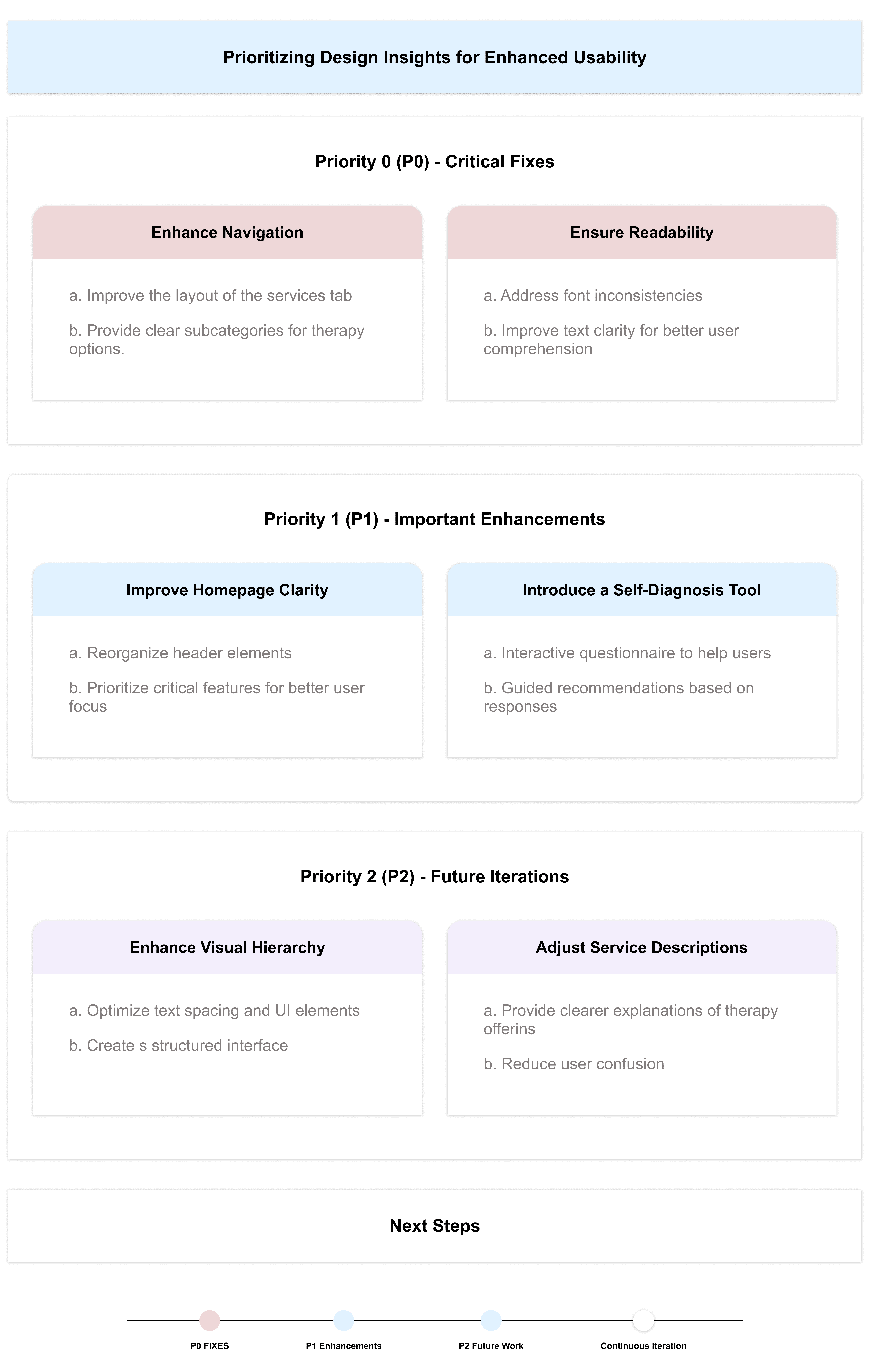By addressing these insights, I aim to create a more structured, accessible, and user-friendly experience for Mind Matters, ensuring that users can easily find the support they need. The iterative design process will continue based on ongoing research and feedback, refining the platform to better serve its users.